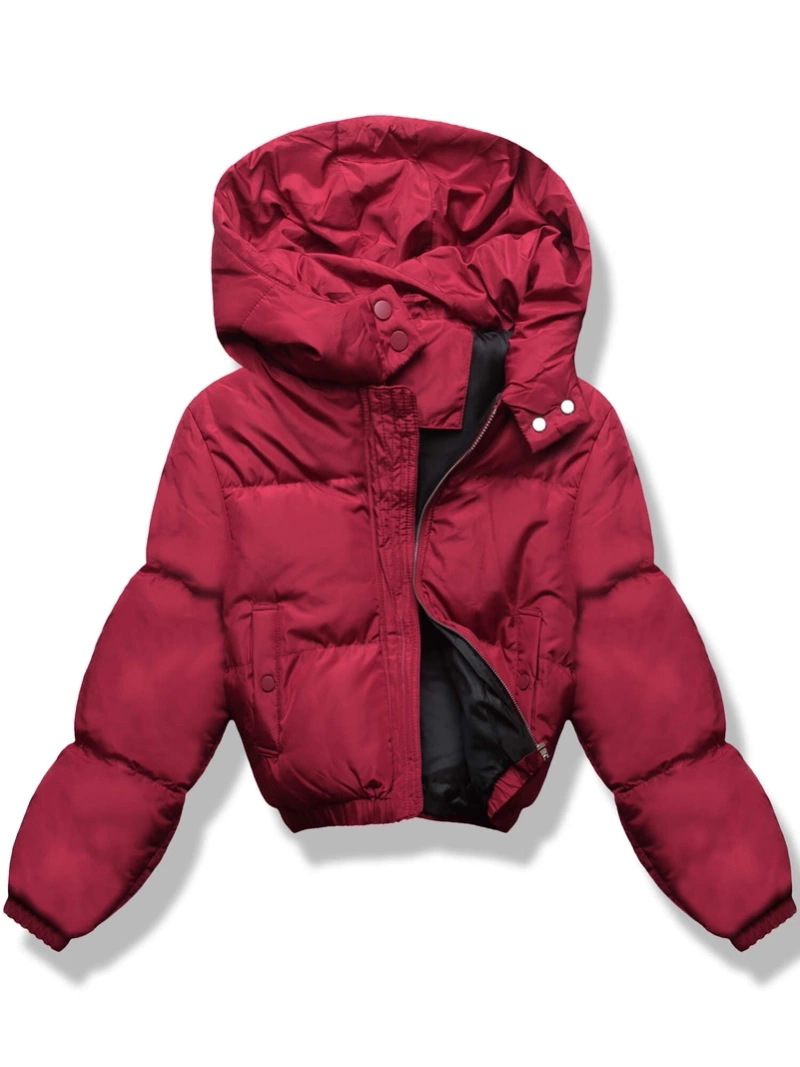 Czerwona lakierowana damska zimowa kurtka z kapturem