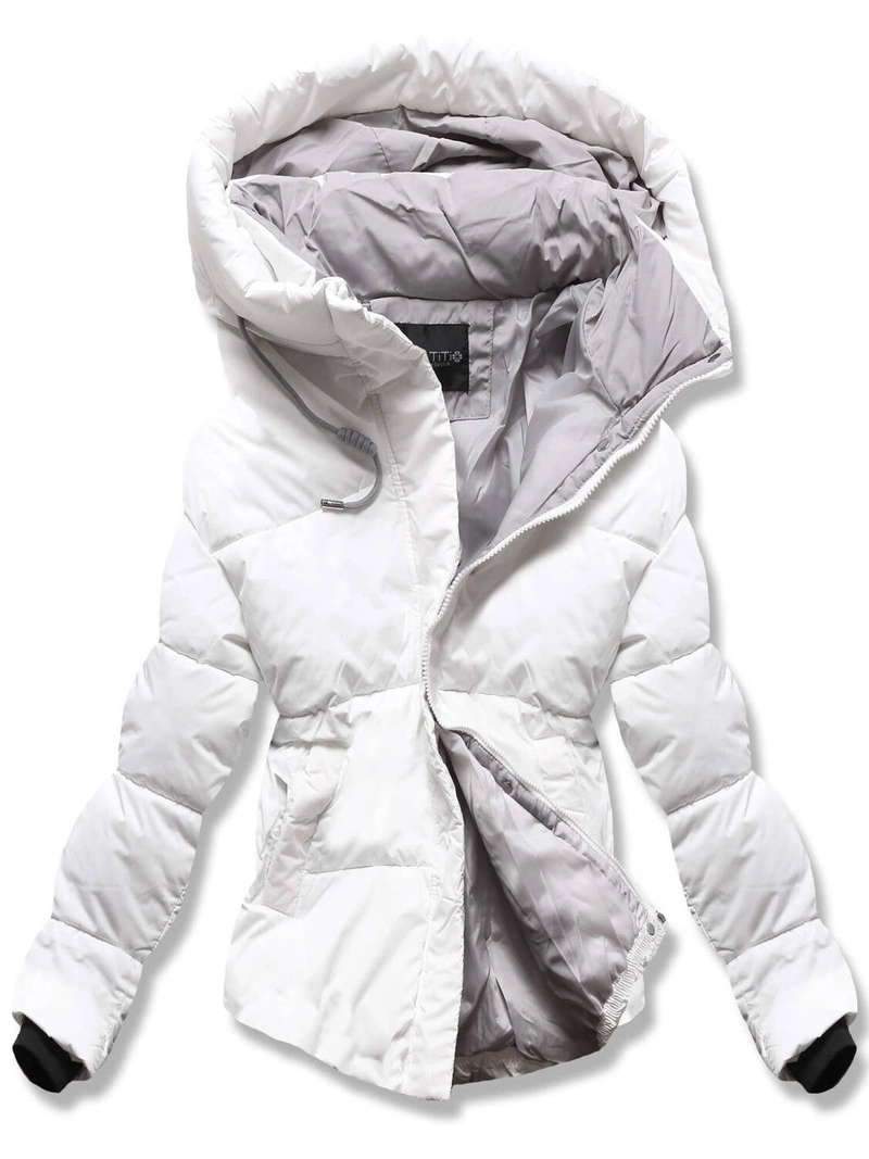 Ecru puchowa pikowana kurtka z kapturem i paskiem