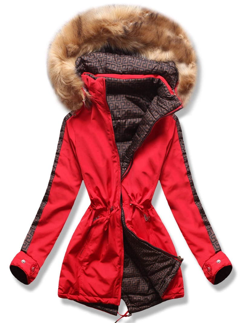 Czerwono brązowa dwustronna damska kurtka pikowana z kapturem