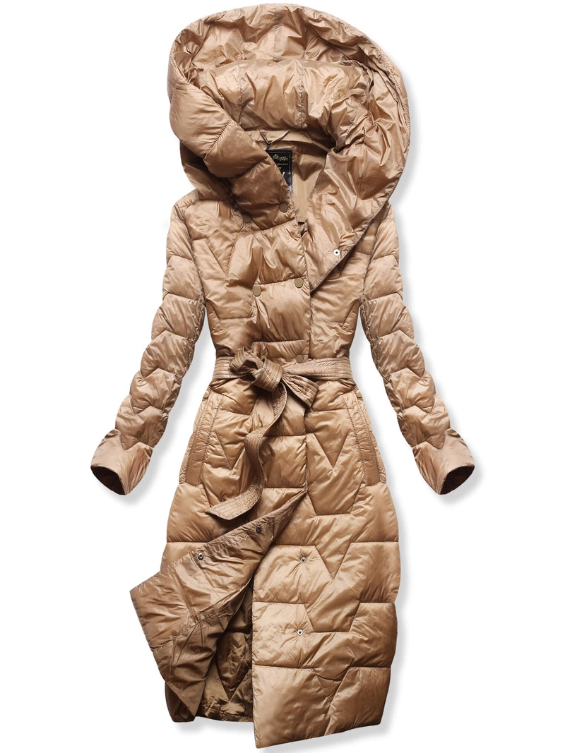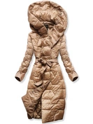 Brązowa pikowana zimowa kurtka z kapturem i paskiem