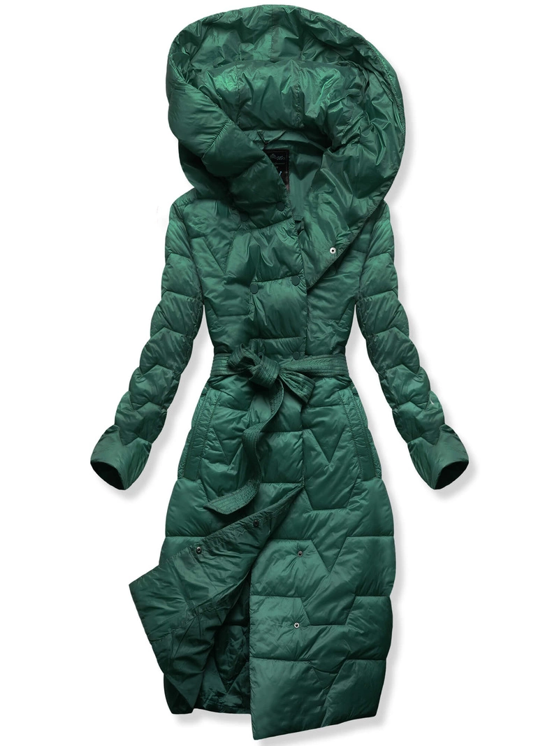 Zielono szara dwustronna zimowa damska kurtka z kapturem i paskiem