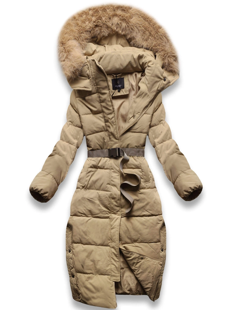 Ciemnobeżowa długa zimowa kurtka damska pikowana z kapturem