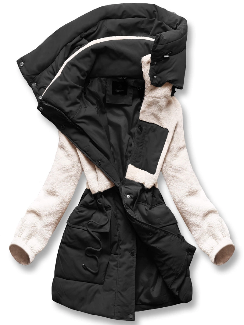 Czarno beżowa damska zimowa kurtka parka z łączonymi materiałami