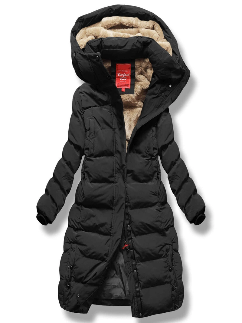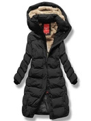 Czarny długi płaszczyk kurtka zimowa - na ciepłym misiu z kołnierzem