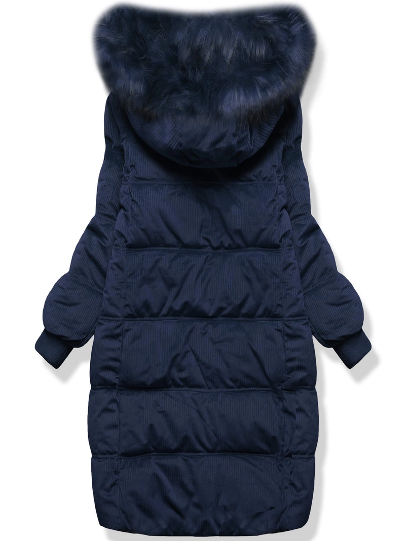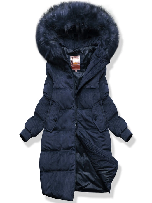 Opinie o Granatowa długa zimowa sztruksowa damska kurtka z kapturem