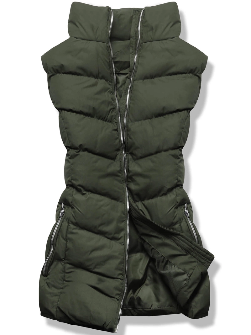 Khaki puchowy pikowany bezrękawnik z kołnierzem kamizelka ze stójką