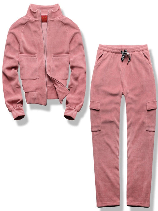 Opinie o Pudrowy prążkowany dres komplet ze stójką