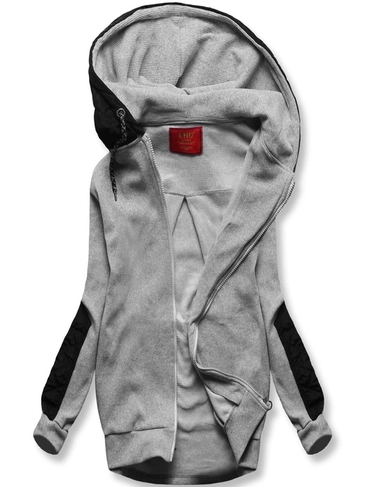 Jasnoszara bluza w prążki z łatami i z kapturem zapinana na suwak