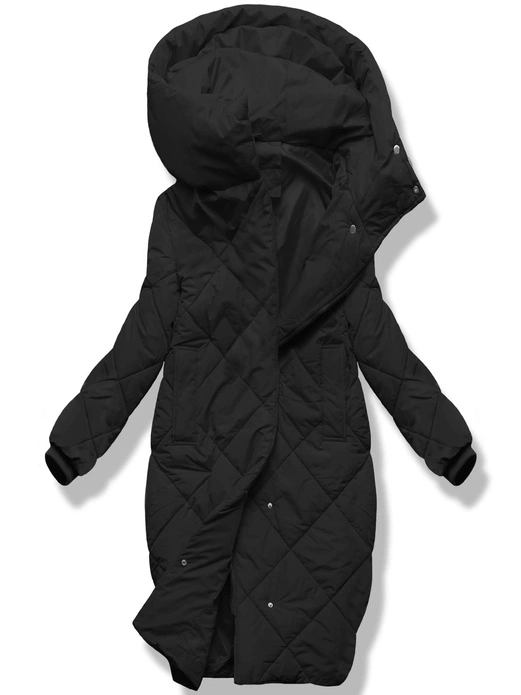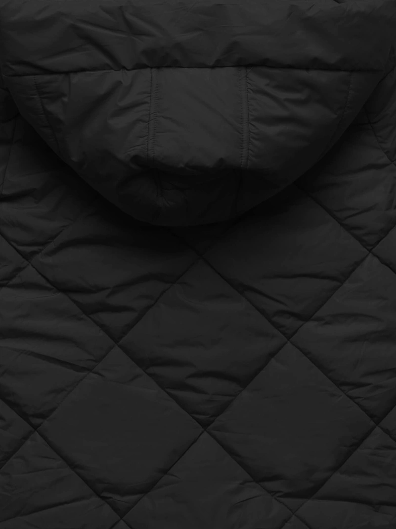 Opinie o Czarna pikowana w karo damska kurtka płaszczyk zimowy z kapturem