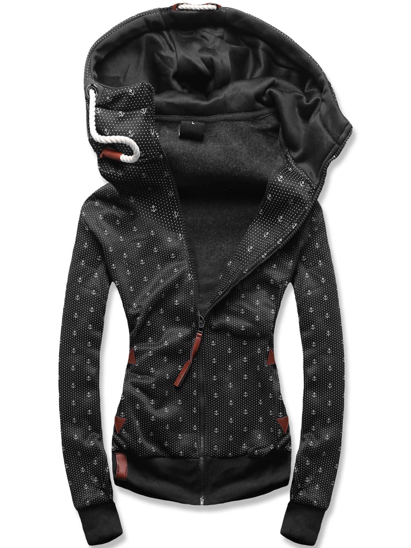 Szukasz stylowej i funkcjonalnej bluzy, która będzie pasować do wielu stylizacji? Ta bluza damska w kotwiczki z kapturem to idealny wybór dla kobiet ceniących sobie komfort i modny wygląd. Wykonana z wysokiej jakości materiałów bluza zapewni Ci ciepło w chłodniejsze dni, jednocześnie pozwalając skórze oddychać. Wyjątkowy wzór w drobne, geometryczne kształty nadaje tej bluzie oryginalnego charakteru, a jednolity kaptur stanowi świetny kontrast, dodając całości spójności. Elastyczne ściągacze na rękawach i na dole bluzy gwarantują idealne dopasowanie i zachowanie ciepła. Dodatkowo, bluza wyposażona jest w praktyczną kieszeń kangurkę, która nie tylko stanowi modny akcent, ale również jest bardzo funkcjonalna.Szczegóły z ekoskóry dodają elegancji, a solidne wykonanie zapewnia trwałość na lata. Ta bluza to doskonała propozycja dla kobiet, które cenią sobie połączenie sportowego stylu z eleganckimi elementami. Idealnie sprawdzi się podczas weekendowych wypadów, jak również w codziennym użytkowaniu. Nie czekaj i dodaj ten wyjątkowy element do swojej garderoby już dziś!