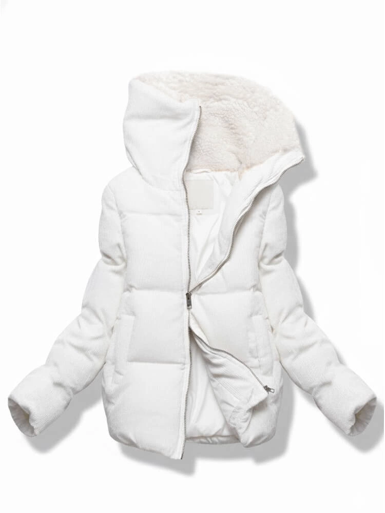 Biała sztruksowa krótka pikowana zimowa kurtka z kołnierzem na futerku zapinana na suwak