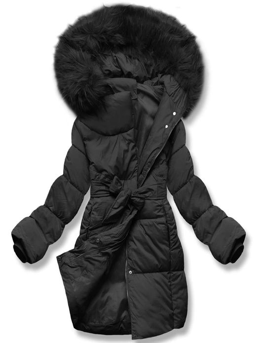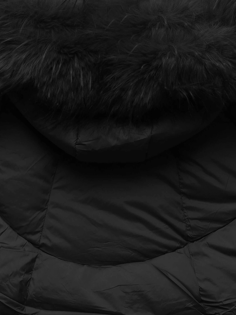 Czarna kurtka zimowy długi płaszcz z dużym kapturem