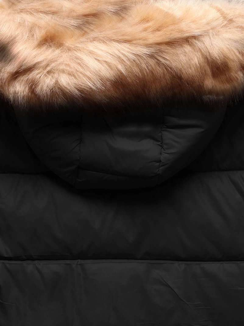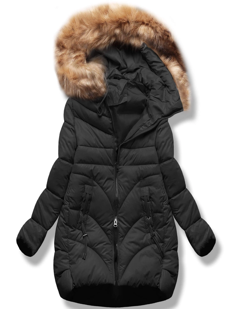 - Damska kurtka z ozdobnymi kieszeniami i kapturem z futerkiem