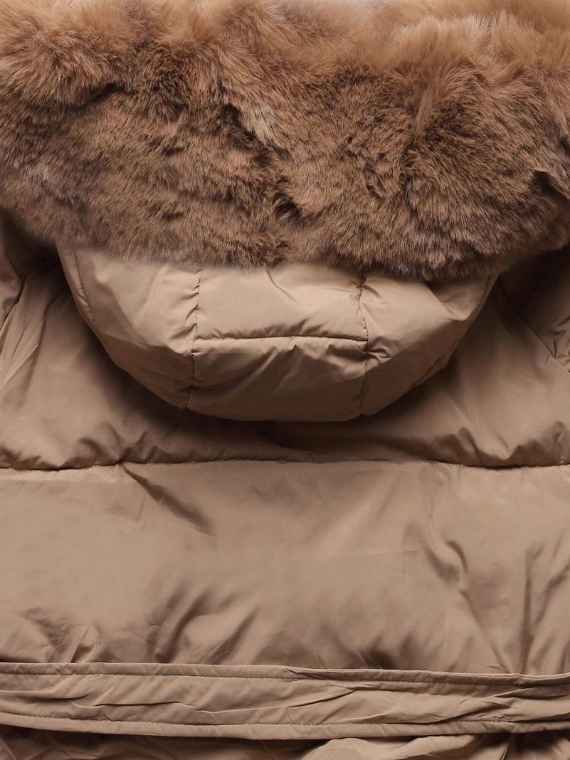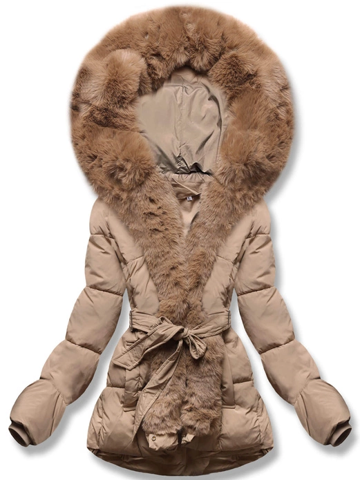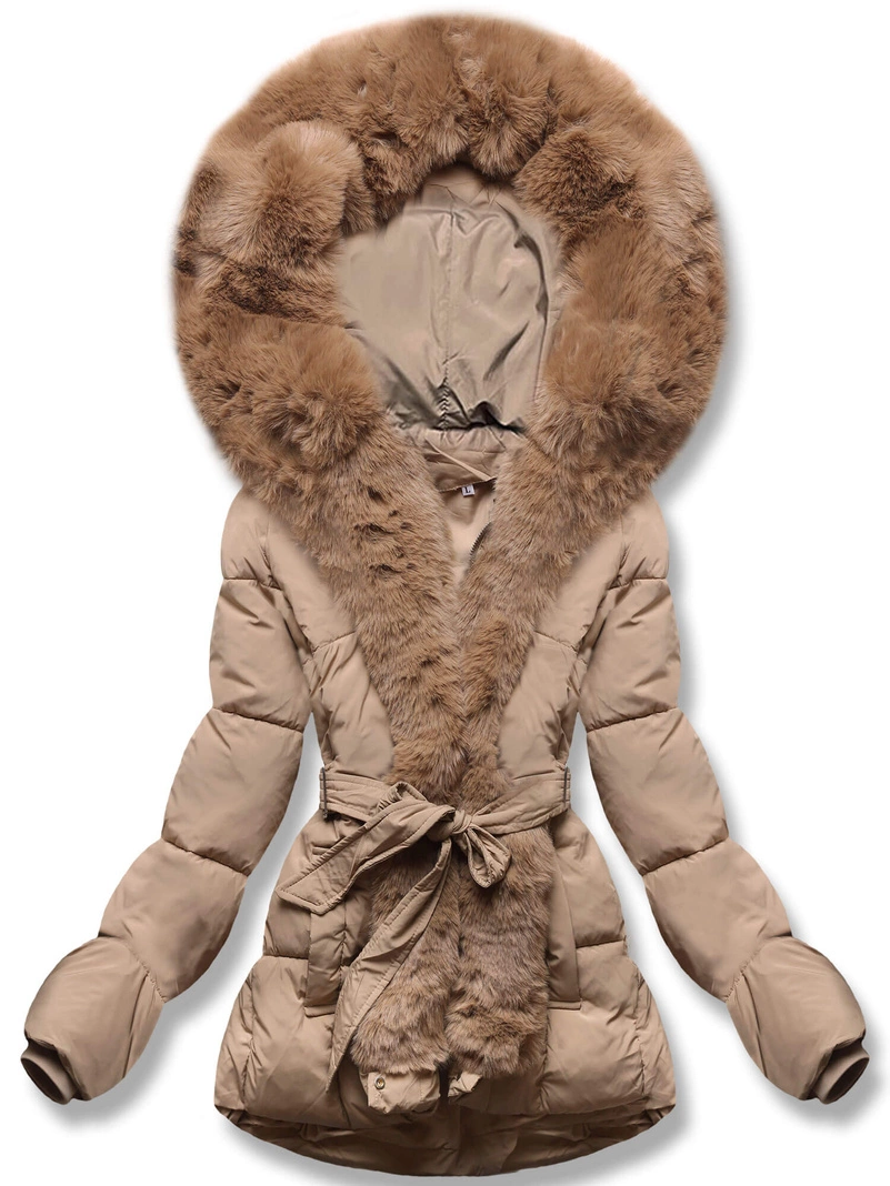 Ciemnobeżowa fenomenalna kurtka damska z paskiem + futro