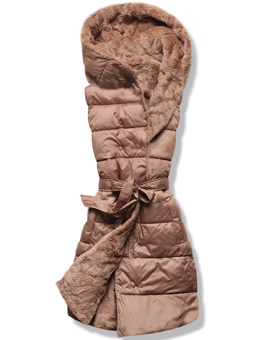 Brązowy dwustronny damski pikowany bezrękawnik z kapturem na futrze
