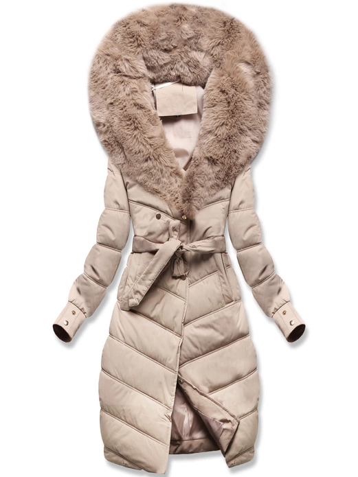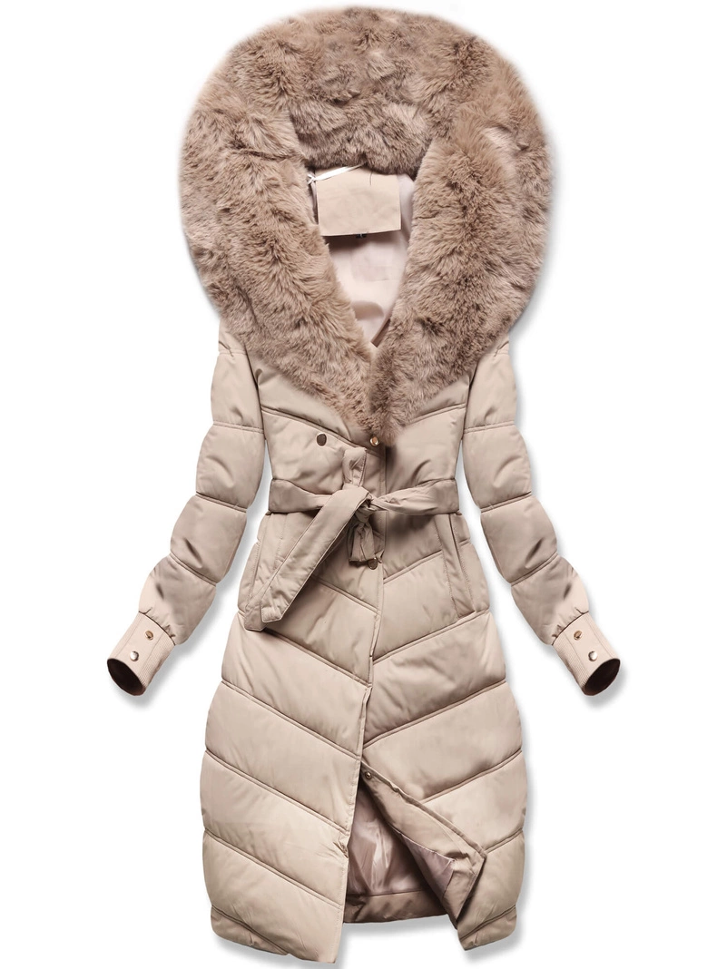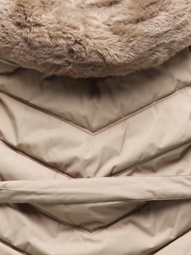 Beżowa damska zimowa kurtka płaszczyk z futrzanym kołnierzem