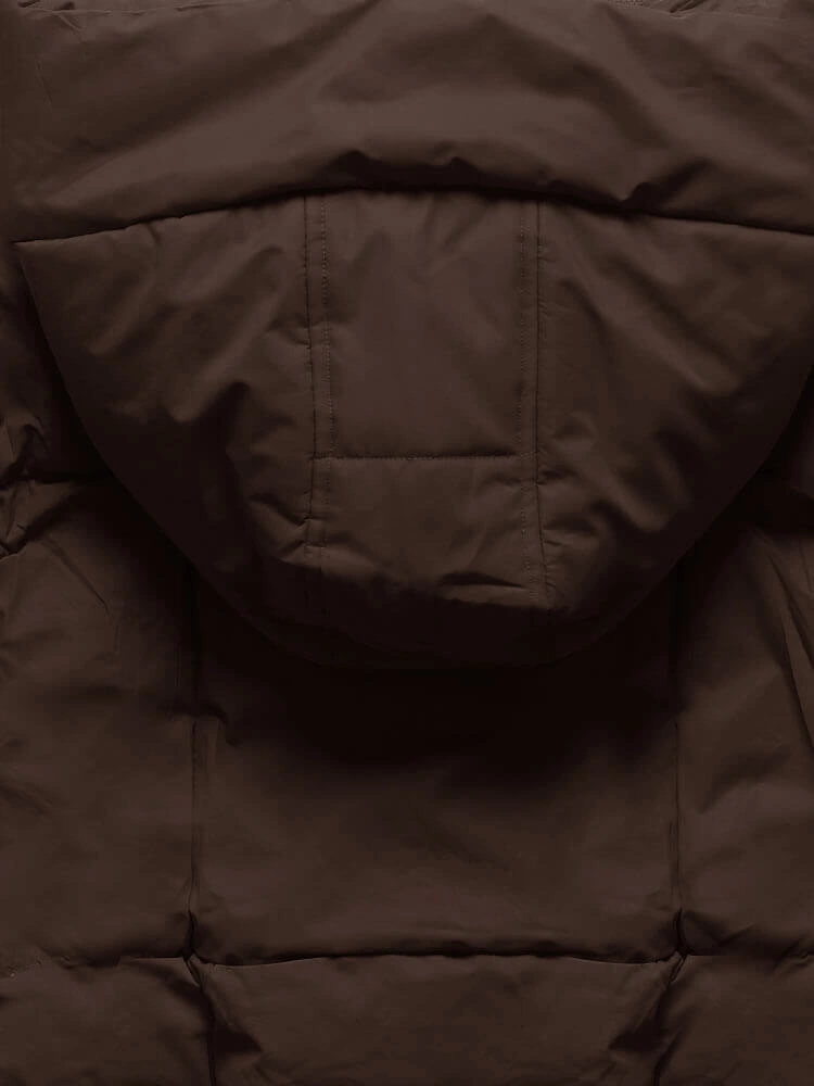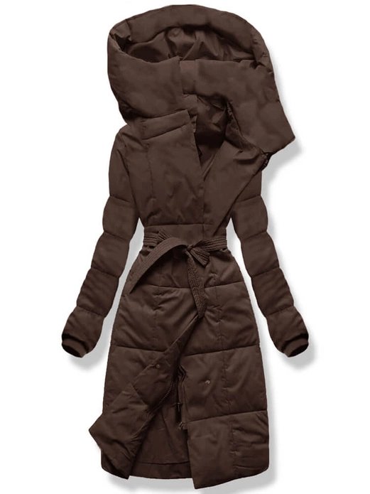 Brązowy zimowy długi płaszcz kurtka zimowa z dużym kapturem