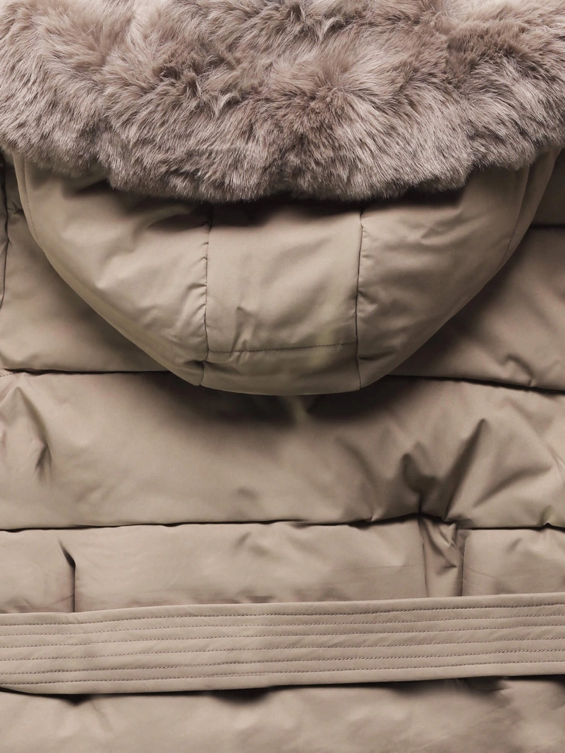- Posiada odpinany futrzany panel wokół kaptura i wzdłuż suwaka