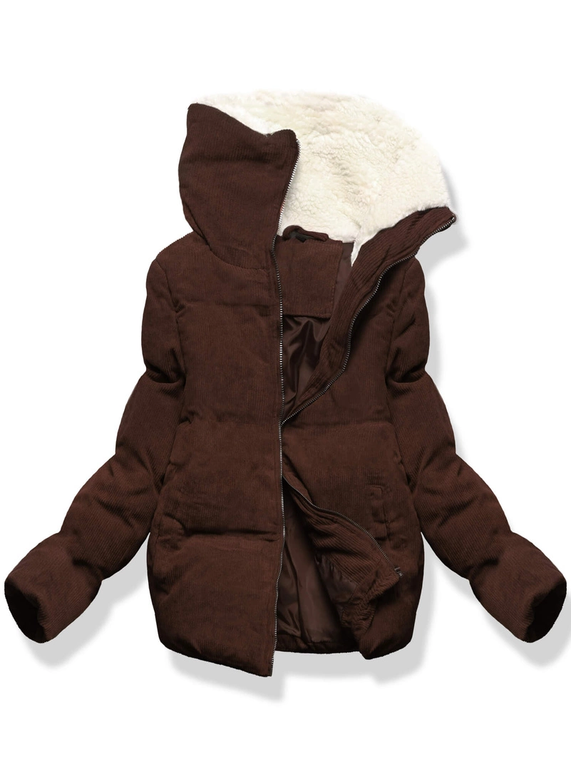 - Sztruksowa krótka pikowana zimowa kurtka z kołnierzem na futerku