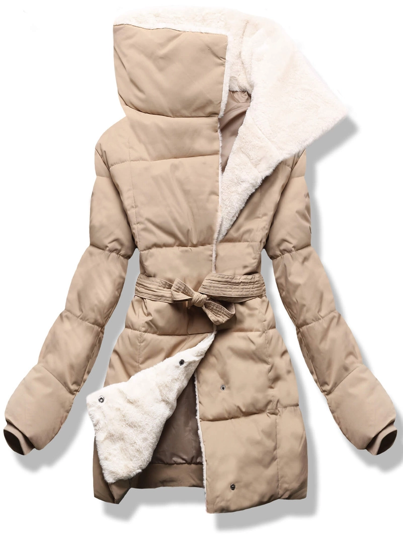 - Beżowa kapitalna ciepła kurtka damska płaszczyk z futerkiem