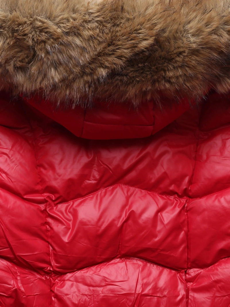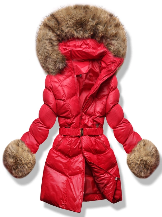 Czerwona świetna pikowana zimowa damska kurtka z futerkiem