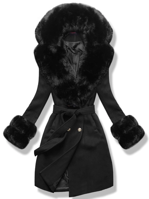 - Czarny piękny damski płaszcz z genialnym futrzanym kołnierzem