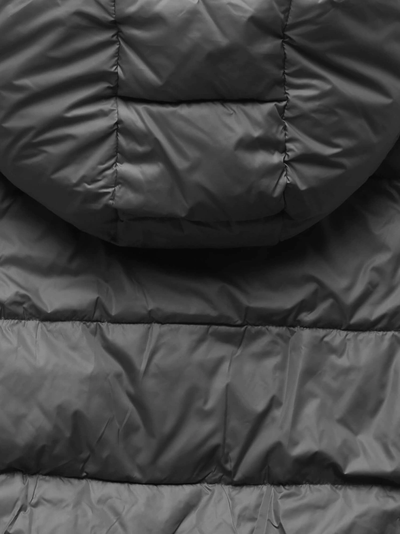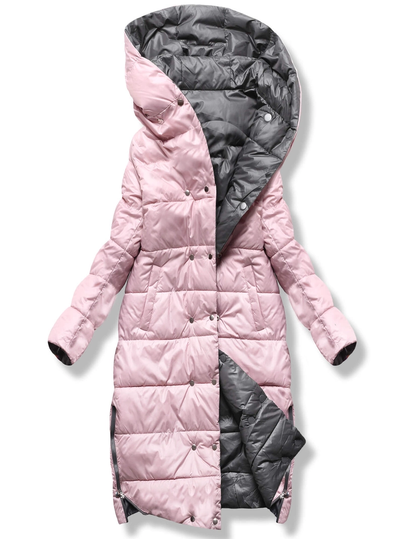 Grafitowo różowa dwustronna zimowa damska kurtka z kapturem i paskiem