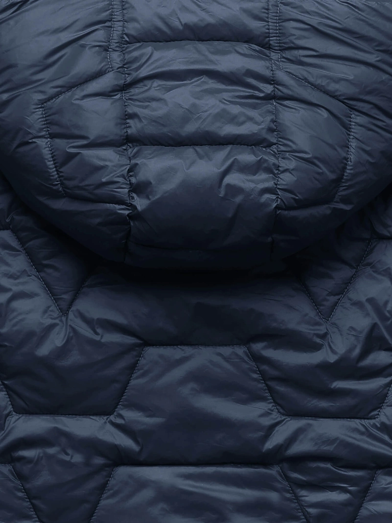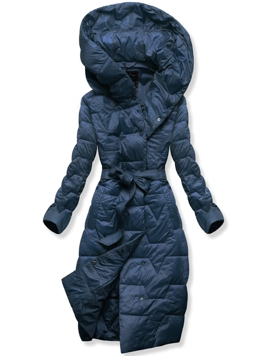 Granatowy damski pikowany płaszcz zimowy z paskiem