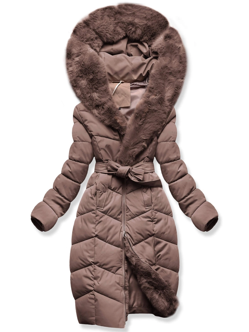Brązowa ciepła zimowa pikowana kurtka z futrzanym kapturem