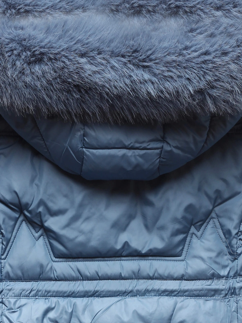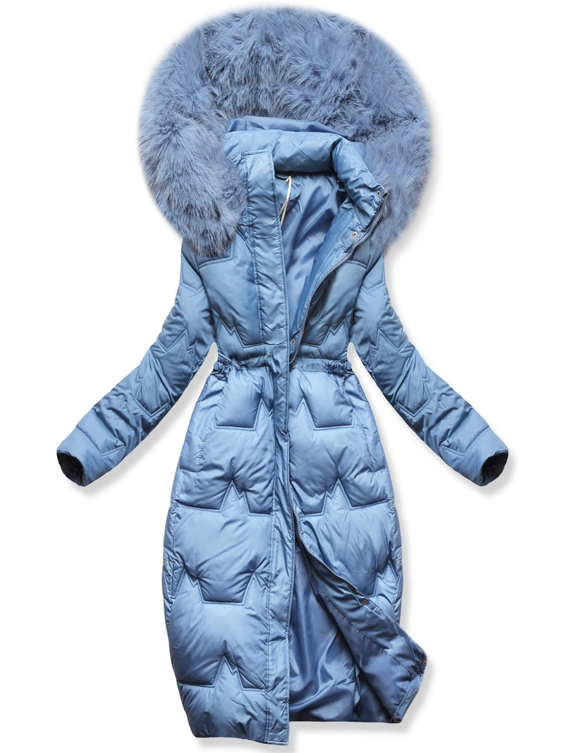Niebieska długa zimowa unikalnie pikowana damska kurtka z kapturem