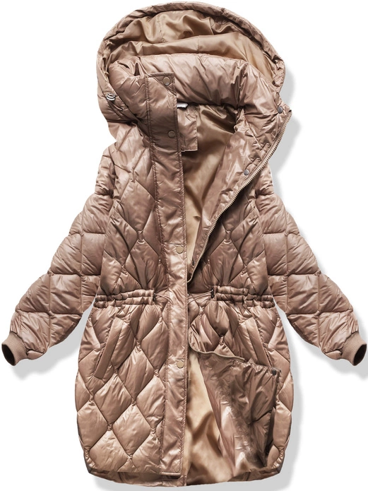 Brązowa oversizowa zimowa damska pikowana w karo kurtka z kapturem