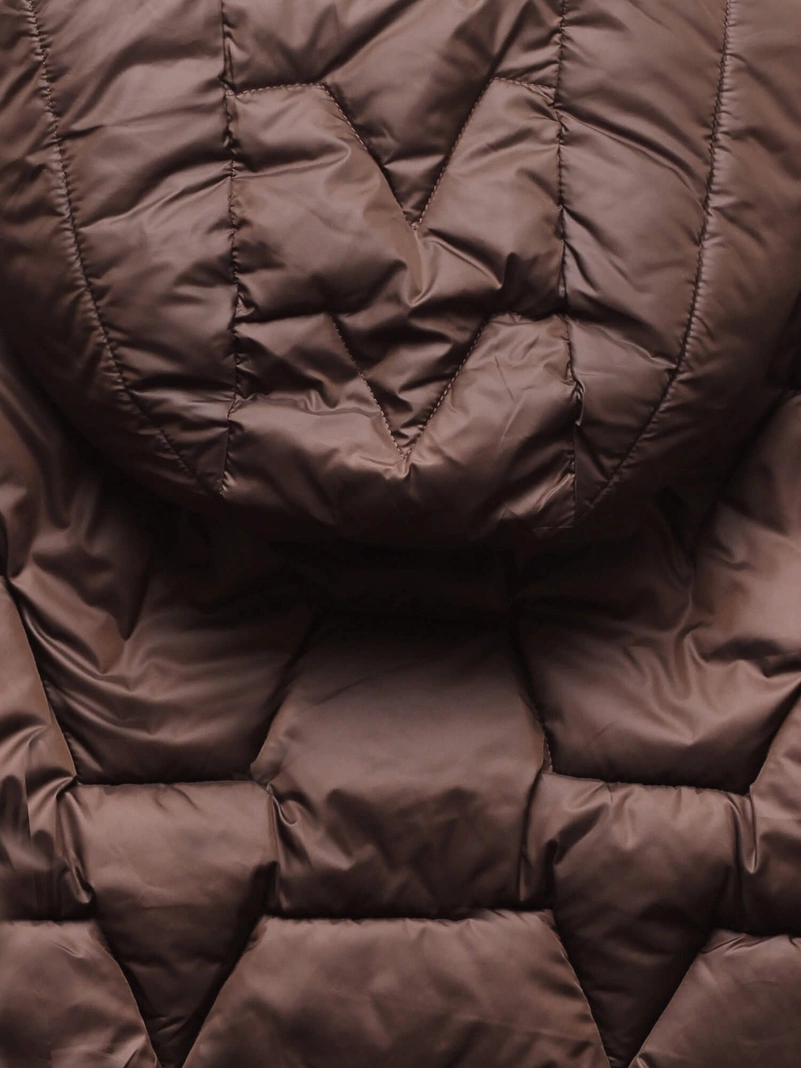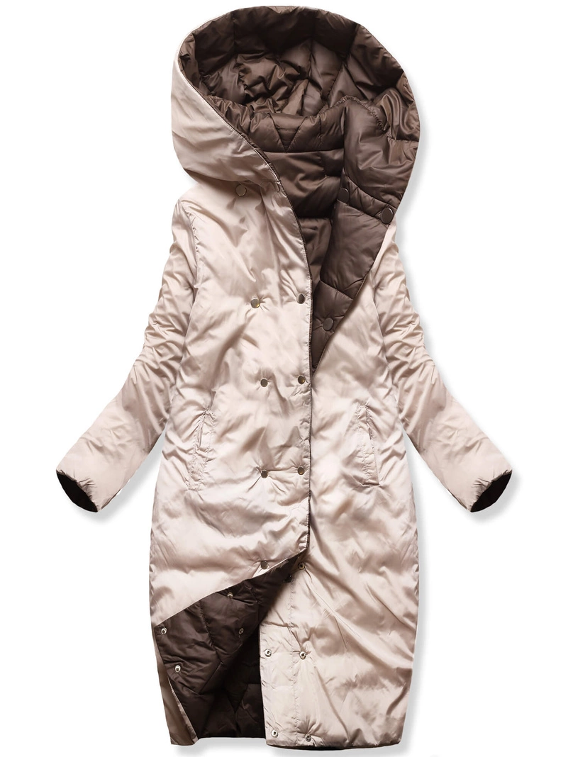 Czekoladowo beżowy dwustronny zimowy damski płaszcz z kapturem i paskiem