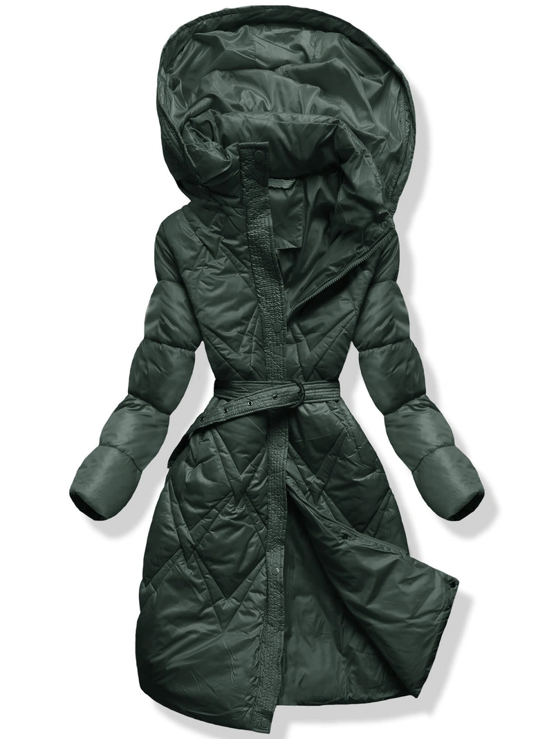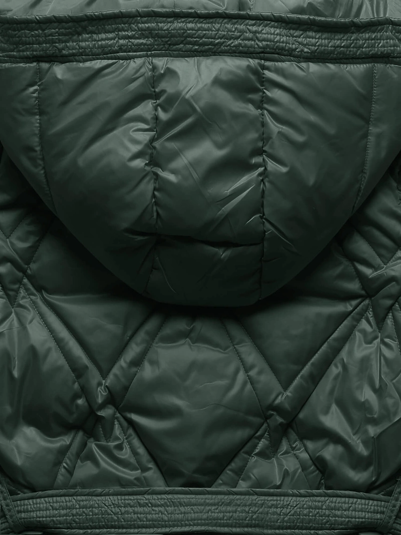 Zielony długi pikowany przejściowy płaszcz z kapturem