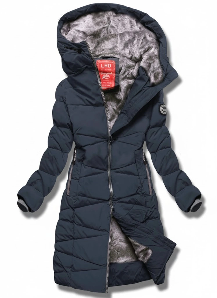 Granatowa długa fikuśnie pikowana kurtka z kapturem na futerku