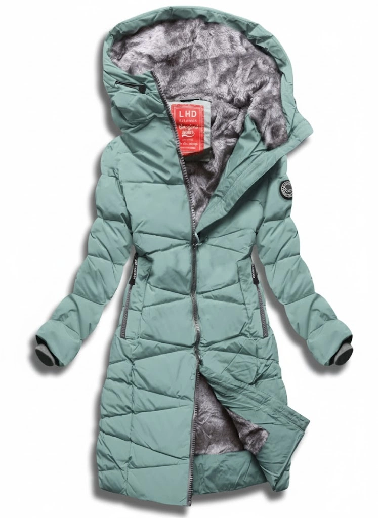 Szarozielona długa fikuśnie pikowana kurtka z kapturem na futerku
