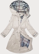 Jasnobeżowy unikalny przejściowy płaszczyk damski parka z kapturem z motywem w kratę