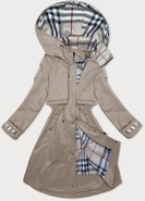 Ciemnobeżowy unikalny przejściowy płaszczyk damski parka z kapturem z motywem w kratę