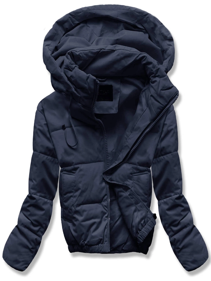 Granatowa krótka damska kurtka z odpinanym kapturem stójka