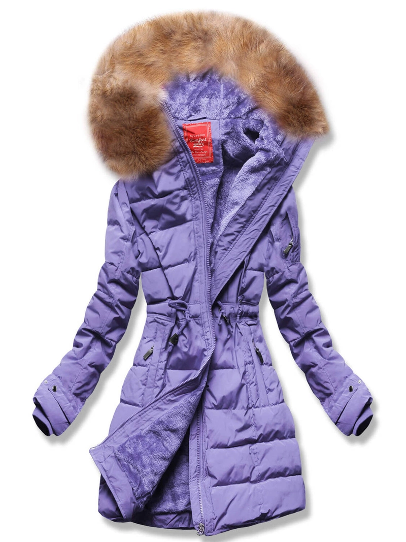 Lila zimowa genialna ocieplana zimowa kurtka płaszczyk z kapturem futerko