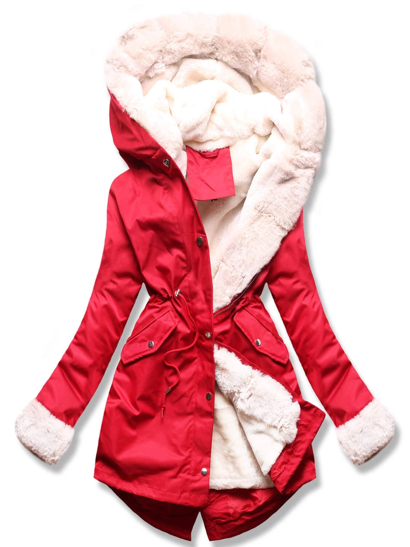 Czerwona zimowa genialna ocieplana zimowa kurtka płaszczyk z kapturem futerko