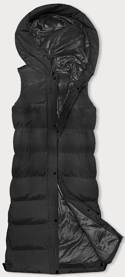Czarny puchowy długi bezrękawnik kamizelka z kapturem