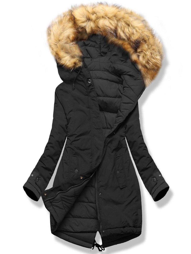 Czarny długi płaszczyk kurtka zimowa - na ciepłym misiu z kołnierzem
