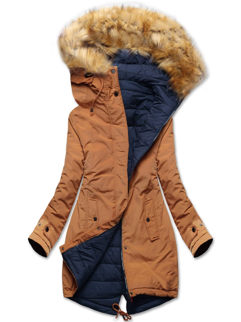 Czarna-Karmelowa długa dwustronna ciepła kurtka parka z kapturem z odpinanym futerkiem