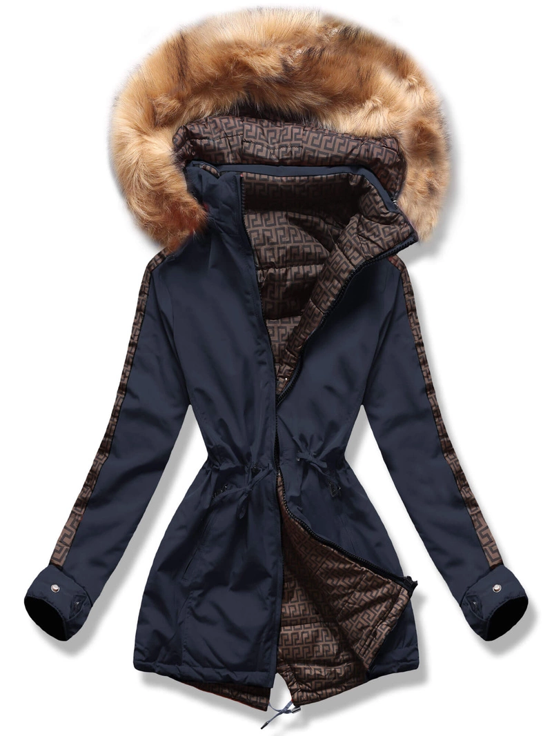 Granatowo brązowa dwustronna damska kurtka pikowana z kapturem