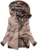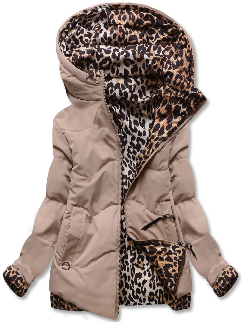 Ciemnobeżowa damska przejściowa kurtka panterka z kapturem